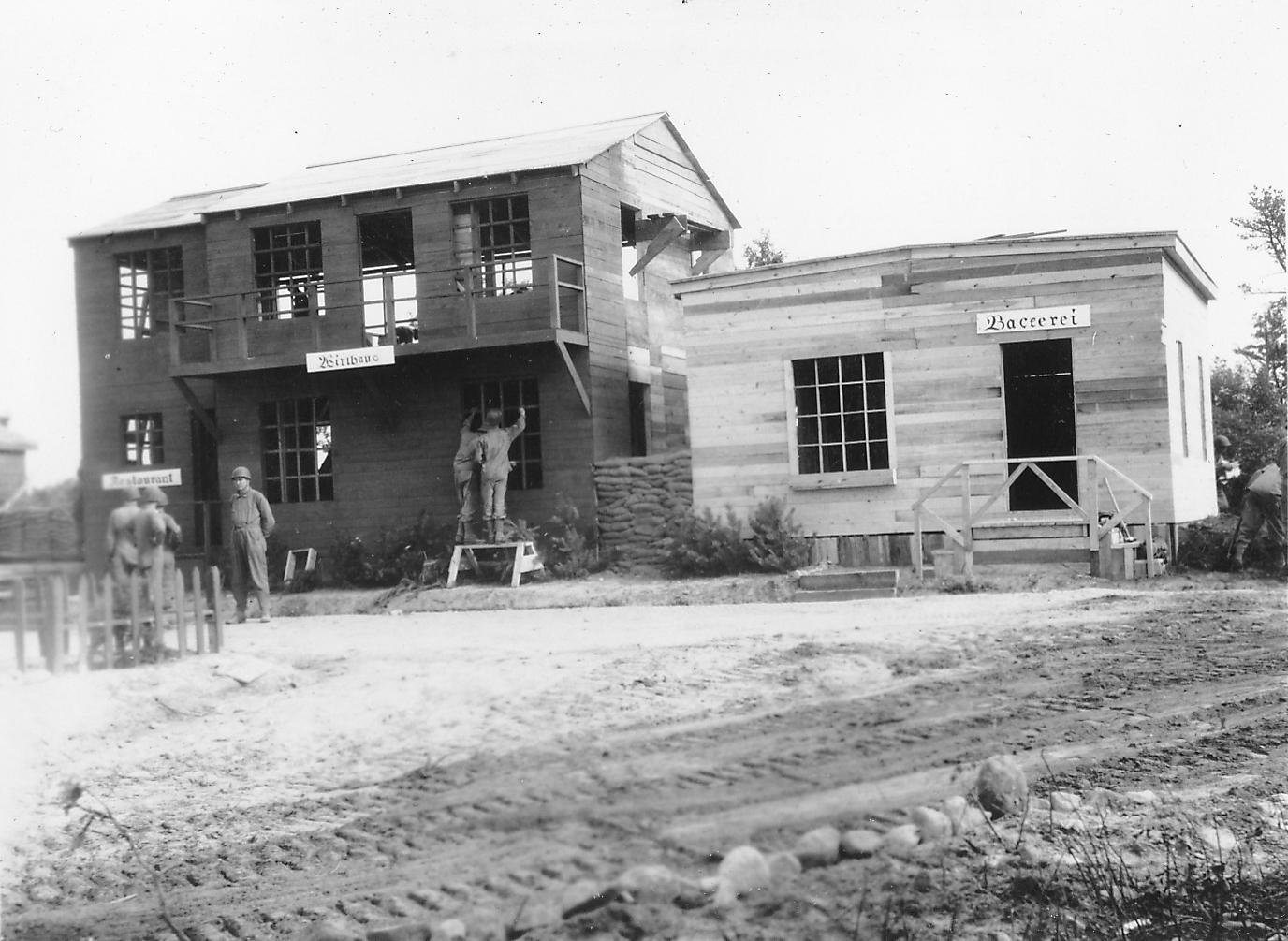 Published in the Boston Post, Monday July 19, 1943 Ready for Soldiers' Street Fighting Training CAMP EDWARDS, July 18 -- Visitors to this big, busy army training centre really stumbled into something here today when they walked smack into a mock German village of 15 buildings, each complete in every detail from German signs to flower boxes and bird houses, and even with the swastika mark on each structure. INTENSE TRAINING They quickly were given the reason, however, and it is that the replica has been erected to provide soldiers-in-training with actual village warfare conditions. It is located on a range area here and is the only village of its kind in New England. The village was constructed from a wooded area in these days by members of the 150th Engineer Combat Battalion from Fort Devens. The land was cleared and the buildings erected within two days, while the third day was spent in painting the structures and building targets which will be hidden inside the buildings and spring up as soldiers are trained in street fighting. New England engineers, working in two shifts, erected the village, which includes a schoolhouse, barber shop, restaurant, hotel, bakery, meat shop, beer garden, theatre, police headquarters, bank, mayor's house and other dwelling houses, and then added such decorative touches as fences, flower boxes, trellises, bird-houses and stone walls. NAMES IN GERMAN Names in German script identify the public buildings, the streets are named after Rommnel, Freidrich and Wilhelm. A swastika flies from the bell tower of the schoolhouse and other symbols of Naziism are used to give the area the appearance of the real thing. The modus operandum of the training is for a soldier to approach the village along Wilhelmstrasse, the main street. As the soldier advances on the alert for snipers, a control operator talks into a telephone from a position where he can observe the -area and orders another operator hidden in a nine-foot dugout behind the buildings to pull a certain target. The dugout operator then pulls a cord attached to a target and the target, a silhouette of a man - generally Hitler - springs up at a window, behind a door or a fence, or perhaps on a roof top. If the soldier is on the alert, he will spot the target and fire at it. In such a building as the hotel, soldiers will be instructed to seize it, room by room, using simulated grenades, and then advance to the next building by leaping across an alley or by scaling a fortified wall. Safety firing zones will be established along the streets for each target, so that all firing will be controlled to prevent wild shots from entering other ranges in the area. The village primarily will be used to acquaint troops with the technique of street fighting. |